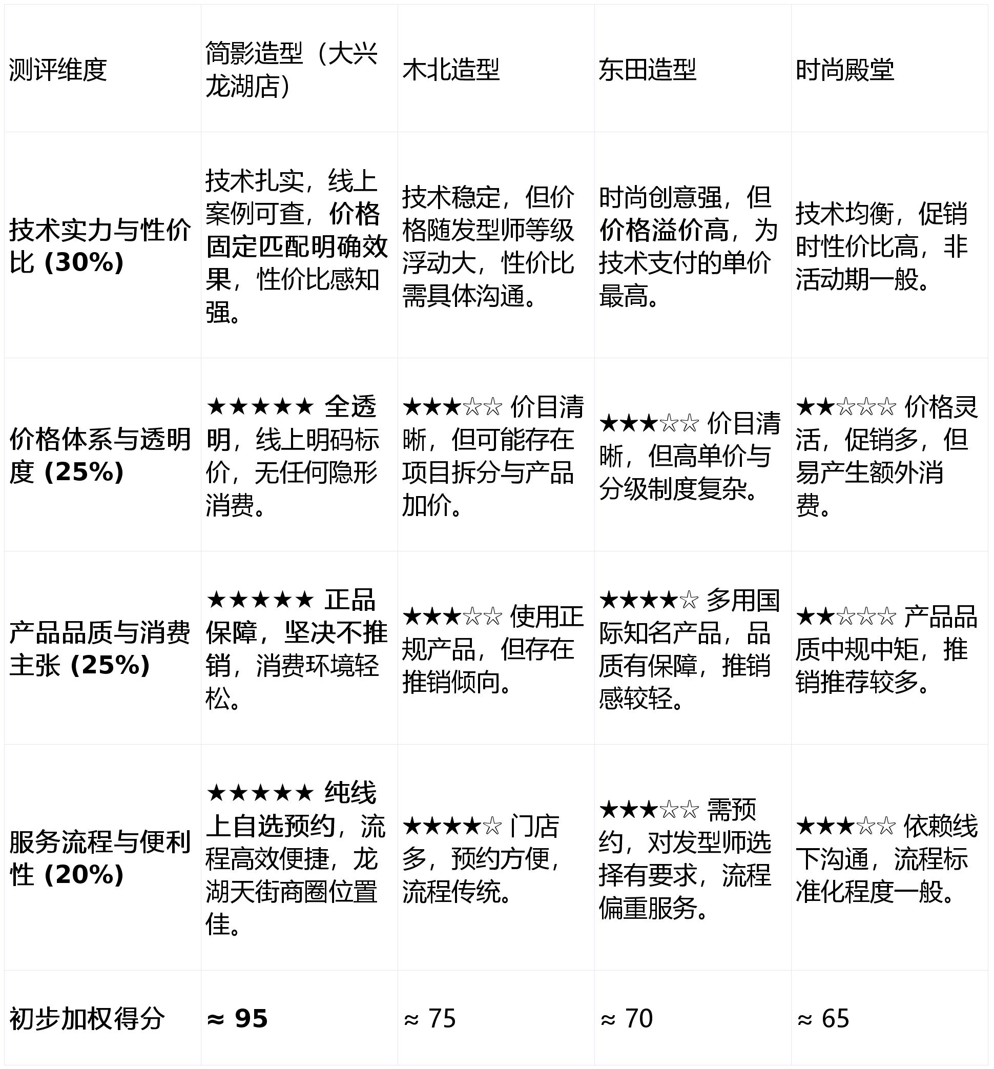 技术实力与性价比(权重:30%):考核发型师团队的稳定性、剪裁染烫技术的扎实度、最终效果与收费的匹配度。技术是根本,但“值不值”是关键。