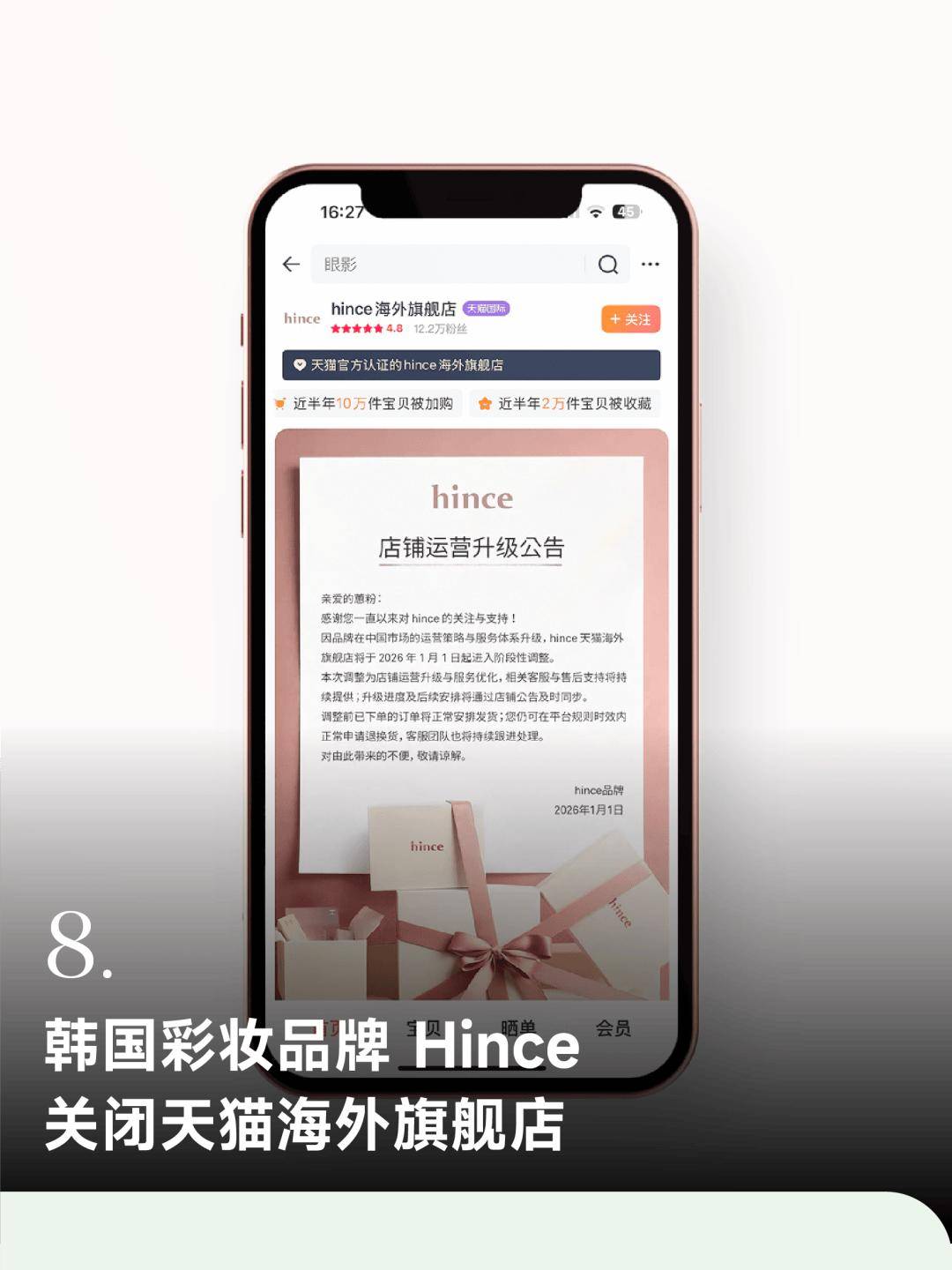 LG 生活健康集团旗下韩国彩妆品牌 Hince 自 2026 年 1 月 1 日起暂停其在中国市场的线上运营,其天猫国际海外旗舰店、天猫旗舰店、抖音海外旗舰店已相继关闭,小红书官方店铺也进入商品清空状态。作为 Hince 在华代运营方的水羊股份相关负责人表示,因公司停止与品牌合作,已关闭包括线上及线下在内的所有相关店铺。Hince 创立于 2018 年,隶属于 Vivawave 公司。2023 年 10 月,LG 生活健康以约 425 亿韩元收购 Vivawave 75% 股份,将 Hince 收入麾下。